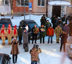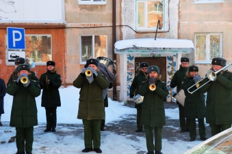В честь праздника оркестр Тюменского высшего военно-инженерного командного училища исполнил для юбилярши песни военных лет. Добровольцы поздравили Александру Васильевну с Днем рождения, пожелали здоровья и больше счастливых моментов.