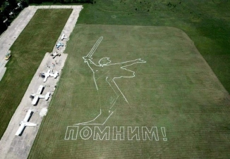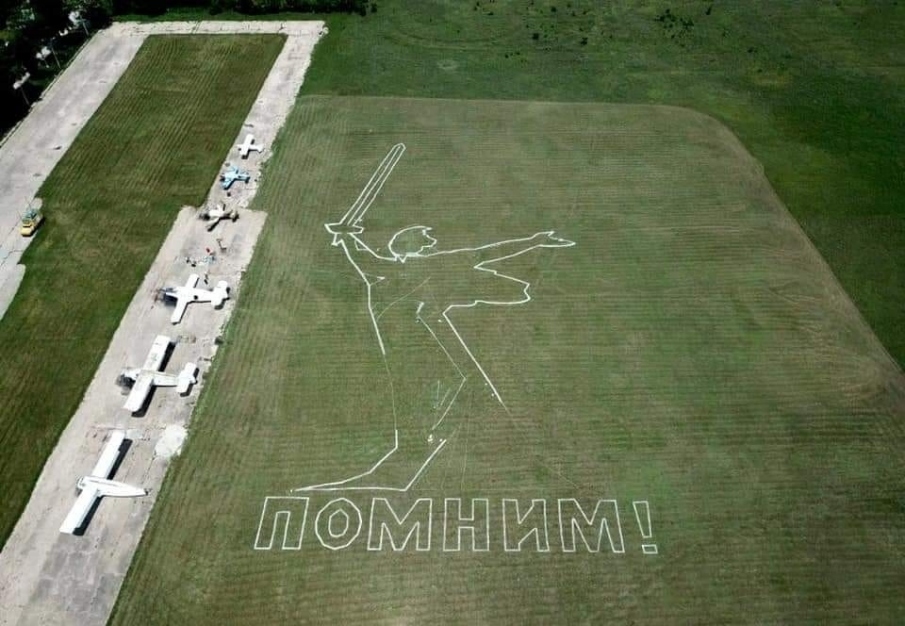 В районе аэропорта Заводское г. Симферополь, на поле в несколько гектар была нанесена картина в форме скульптуры «Родина-мать зовет!». Изображение видно с высоты полета самолетов гостям и жителям Крыма.