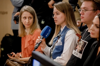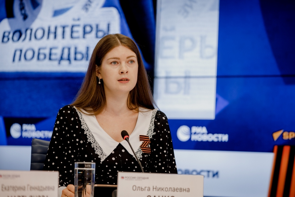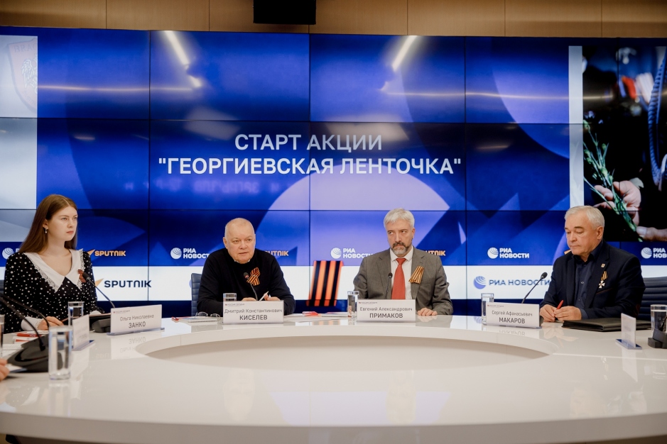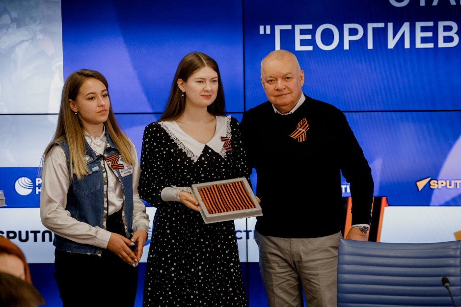 Руководитель Волонтеров Победы, зампред комитета ГД по развитию гражданского общества Ольга Занко и генеральный директор МИА «Россия сегодня» Дмитрий Киселев дали старт традиционной акции «Георгиевская ленточка». С 2015 года «Волонтеры Победы» помогают в проведении акции.
