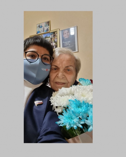Поздравив жительницу Анадыря, Почётного гражданина Чукотки, чьё имя увековечено в «Книге Почёта Чукотки», Елена Евтюхова пожелала имениннице здоровья, долгих лет жизни и всего самого наилучшего, а также вручила памятный подарок и сладости к чаю.