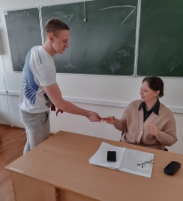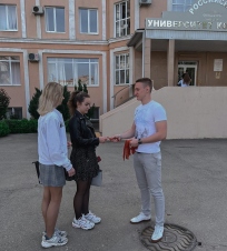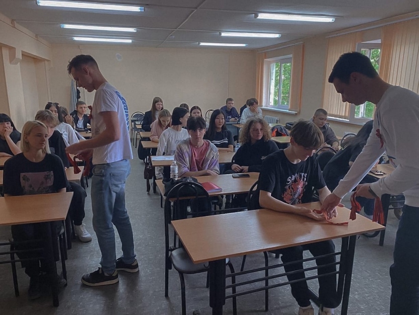 Ребята поздравили профессорско-преподавательский состав и студентов с наступающим праздником и рассказали ребятам историю акции «Георгиевская ленточка», значение символа, а также о том, как следует его носить.