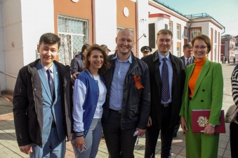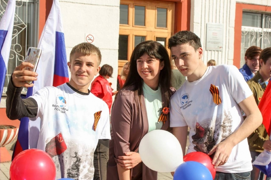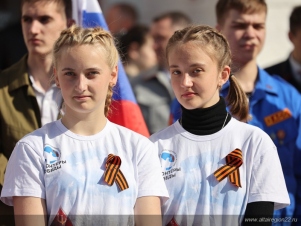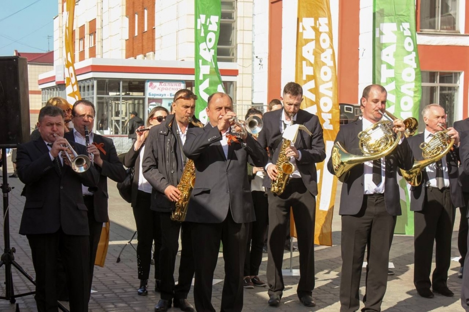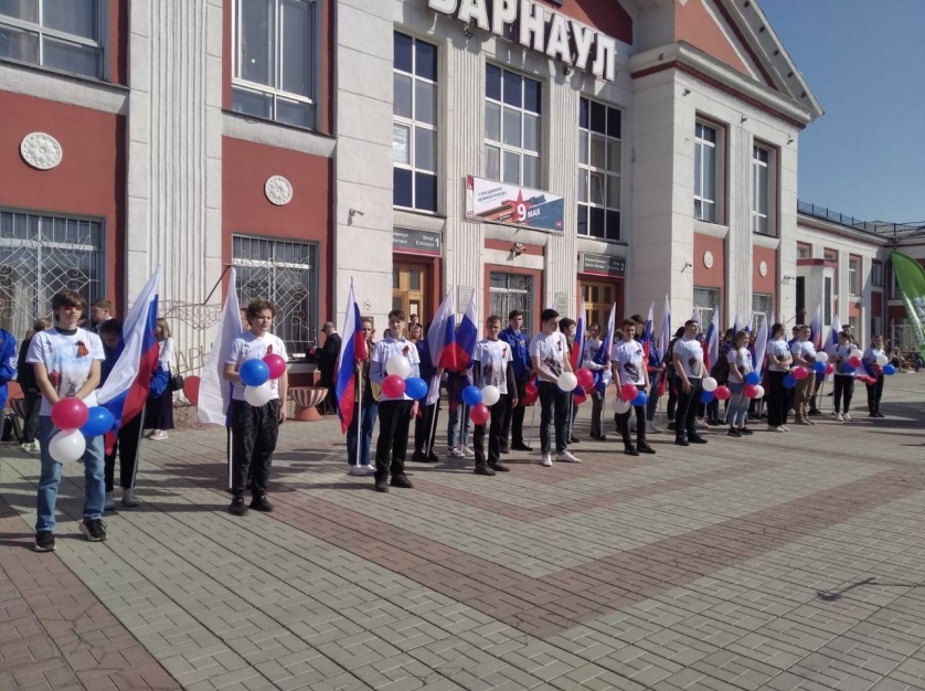 Волонтёры Победы с флагами в руках слушали патриотические композиции от барнаульского оркестра и встречали гостей митинга.