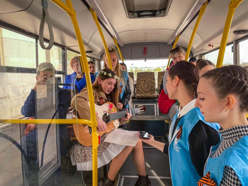 На главных автобусных маршрутах волонтеры создавали праздничное настроения при помощи своего голоса и умения игры на гитаре, а на городских пространствах предлагали приобрести жителям города "Красную гвоздику".