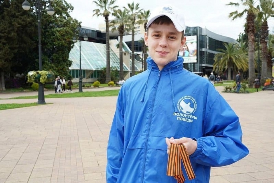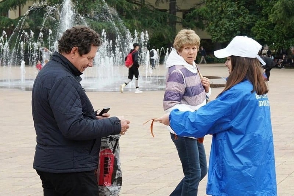 На центральных улицах и парках жителям и гостям Сочи Волонтёры Победы вручают символ Победы.