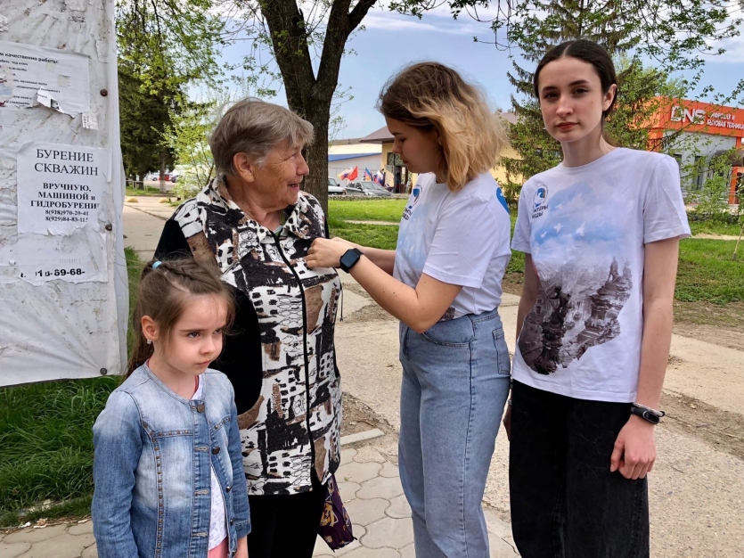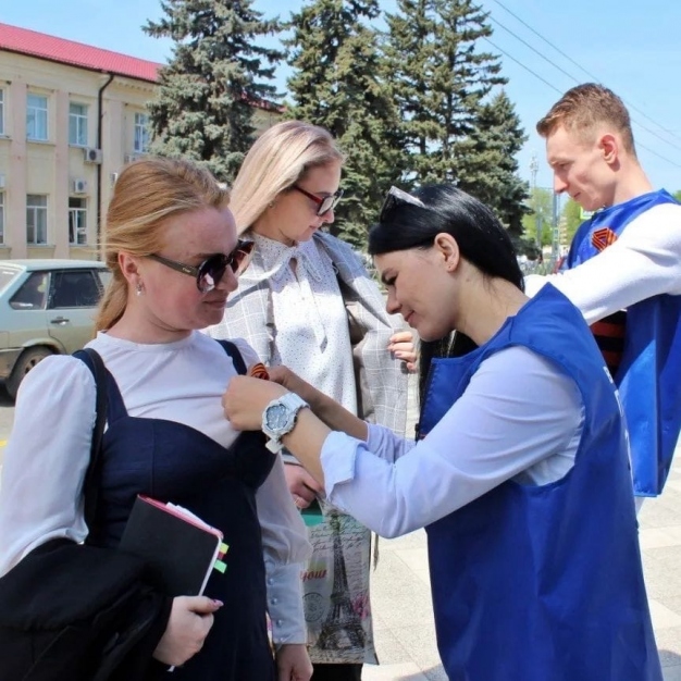 В станице Динской Динского района молодежь района прикрепляет всем желающим символ Победы.