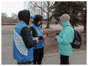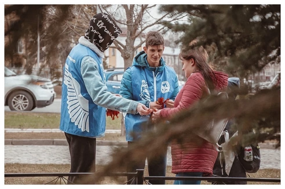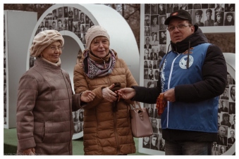 Волонтёры раздавали жителям и гостям города Петрозаводска Георгиевские ленточки на улицах, около мемориальных комплексов, памятников и в общественных местах.