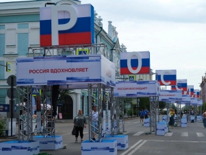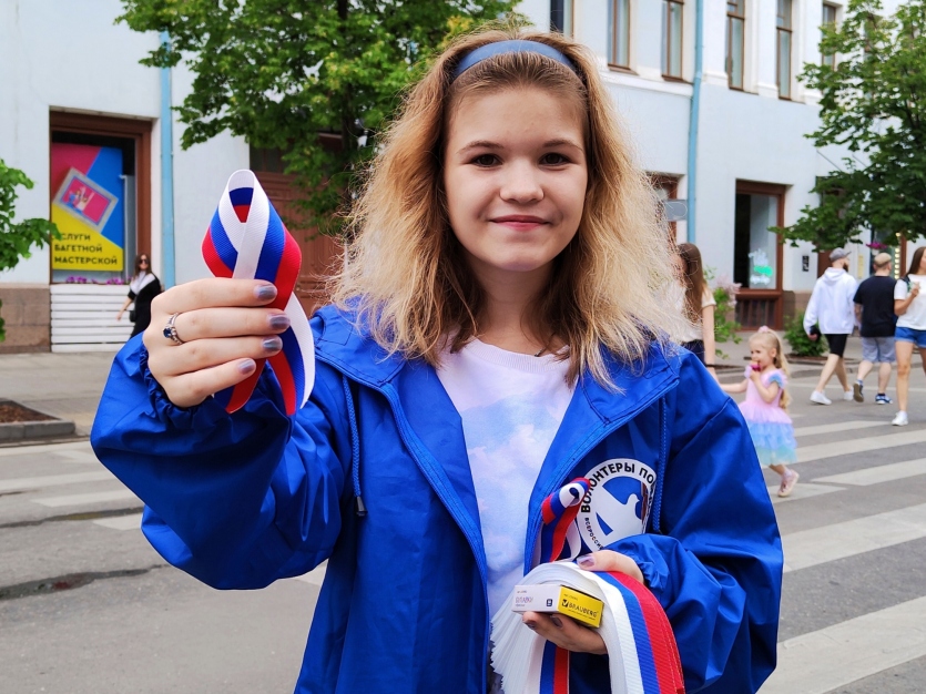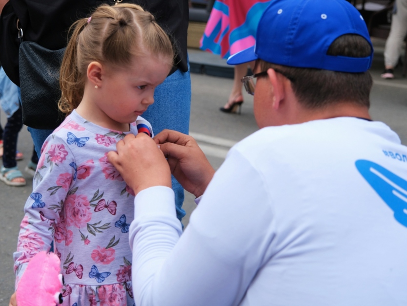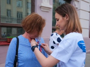 12 июня активисты движения «Волонтёры Победы», в рамках фестиваля «Под мирным небом», который проходил в центре Красноярска на проспекте Мира, вручали ленты с цветами государственного флага всем прохожим горожанам.