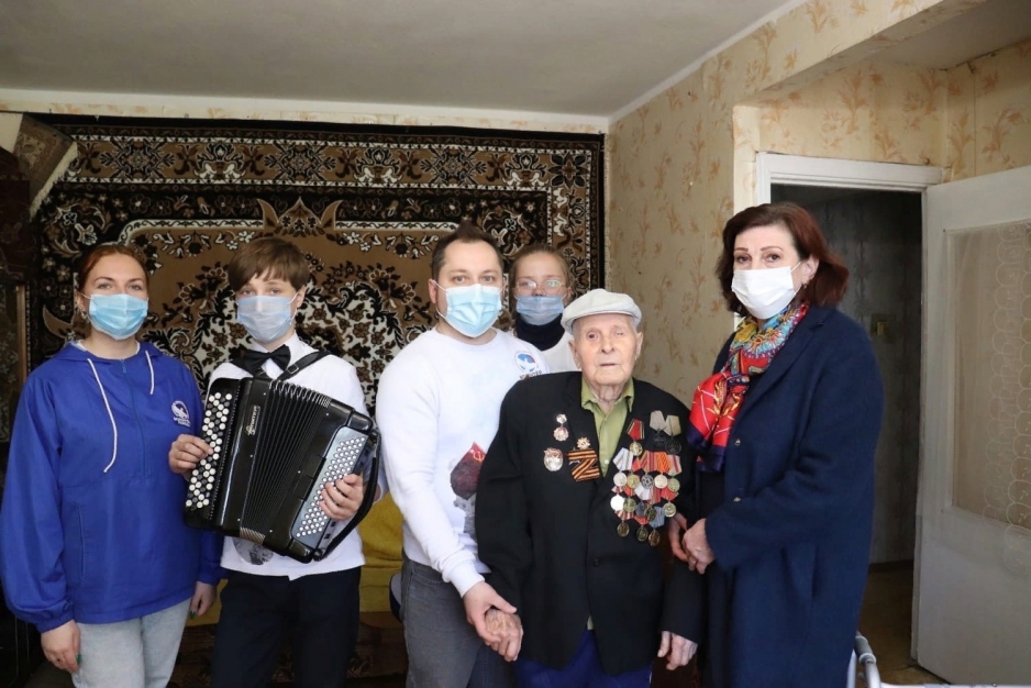 В этом году в поздравлениях принял участие молодой волонтер Владимир Королев, который уже семь лет играет на баяне. Вместе добровольцы исполнили для героев песни военных лет.