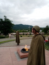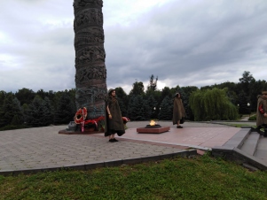 Дежурили у Вечного огня от получаса до часа, два добровольца несли Вахту памяти, стоя у Вечного огня.