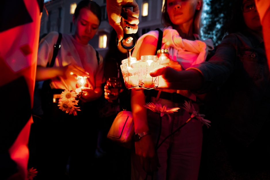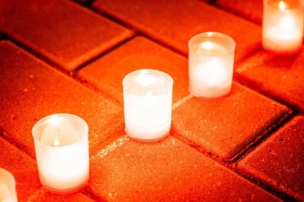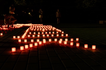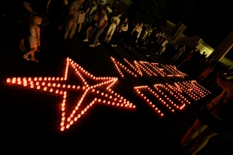 Рядом с Обелиском у стены с именами погибших волонтёры выложили из свечей слова «Липецк помнит» и красную звезду.