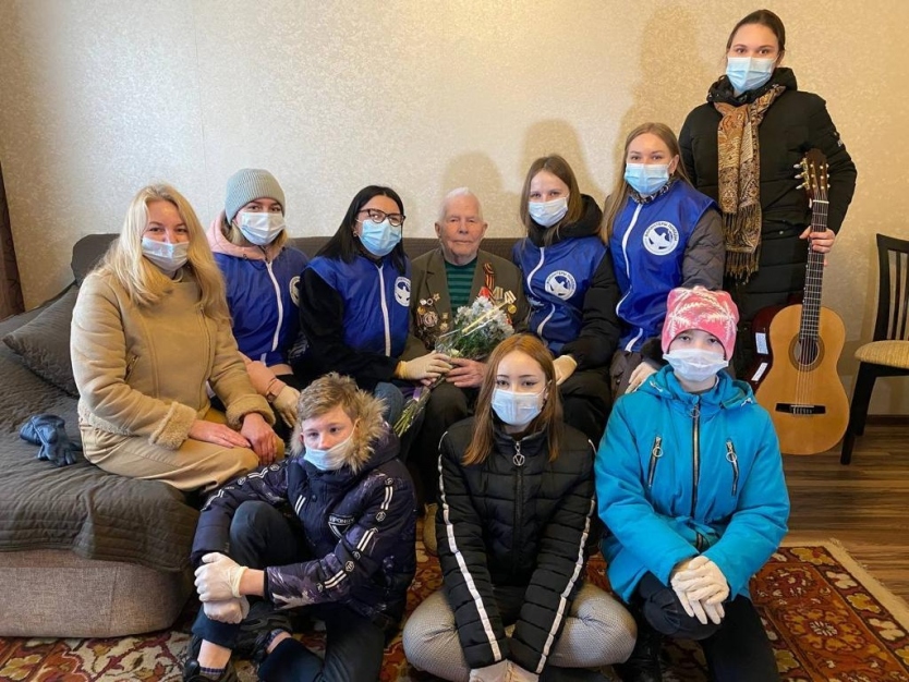 Добровольцы подарили пледы, сладости, цветы и выступили с творческими номерами. Вместе с волонтерами ветеранов пришли поздравить воспитанники первого санаторного детского дома. Они подготовили открытки и подарки своими руками. Вместе с ветеранами волонтеры пели военные песни под гитару.