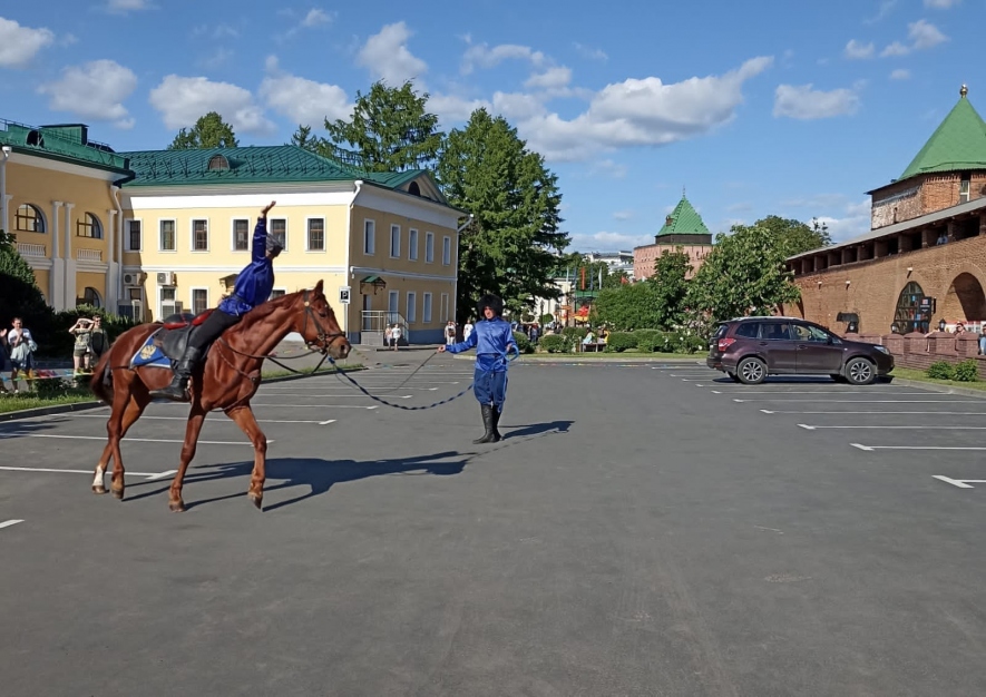 В Нижегородском кремле в предпраздничный день посетители погрузились в атмосферу казачества XVIII века, с традиционными обычаями и конными представлениями. Волонтеры АНО «Достижение» продемонстрировали свои навыки верховой езды, выполнили более десяти трюков верхом на лошади, а также продемонстрировали свое мастерство в стрельбе из лука. Самые громкие аплодисменты зрителей заслужили казачий танец в национальных костюмах и шоу с жонглированием казачьими шашками. После показательных выступлений все желающие могли принять участие в мастер-классе по жонглированию деревянными шашками, а также сфотографироваться вместе с лошадьми.