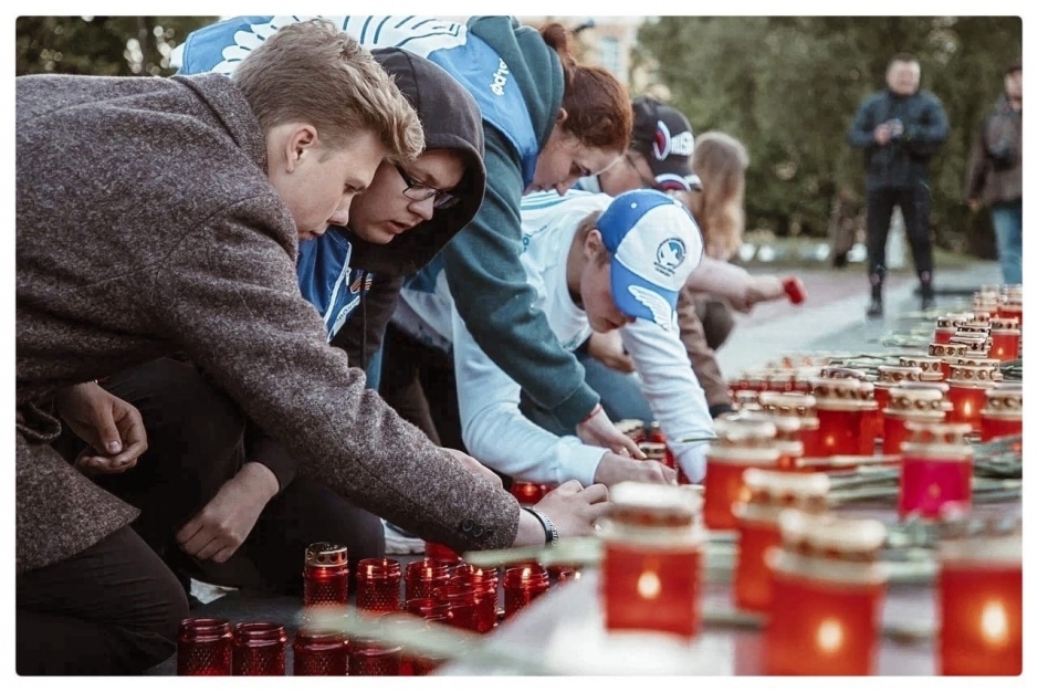 Волонтёры вместе с Юнармейцами, активистами молодёжных объединений, гостями и жителями города Петрозаводска собрались у стелы «Город воинской славы» и выложили огненную картину из свечей - фигуру звезды с датами начала и окончания Великой Отечественной войны.