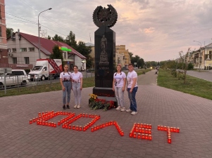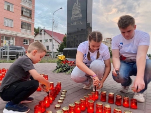 Вечером Волонтёры Победы совместно с администрацией города Барнаула зажгли у Памятного знака надпись из свечей «100 лет» в память о герое.