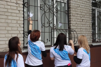 Активисты почтили минутой молчания тех, кто погиб в результате террористического акта, организованного с 1 по 3 сентября 2004 года в городе Беслан, а затем расклеили на окнах администрации Железнодорожного района бумажных белых голубей.