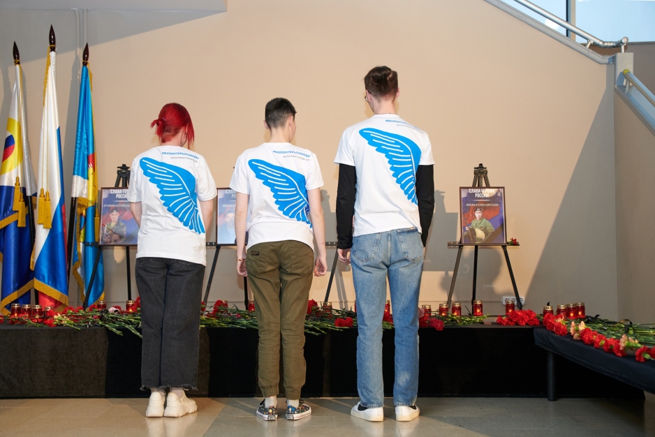 Жители Чукотки возложили цветы к мемориалу воинов-героев, развёрнутому в Доме народного творчества по инициативе Владимира Бедункевича — руководителя городского отделения ВОД «Волонтеры Победы».