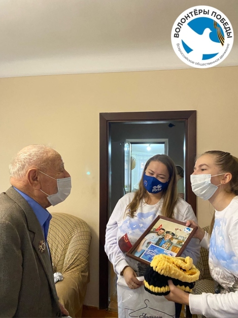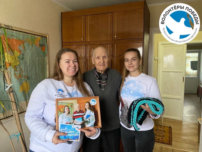 В качестве небольшого подарка вручили тёплые шарфики связанные волонтёрами, фотографию на память и благодарственную открытку.