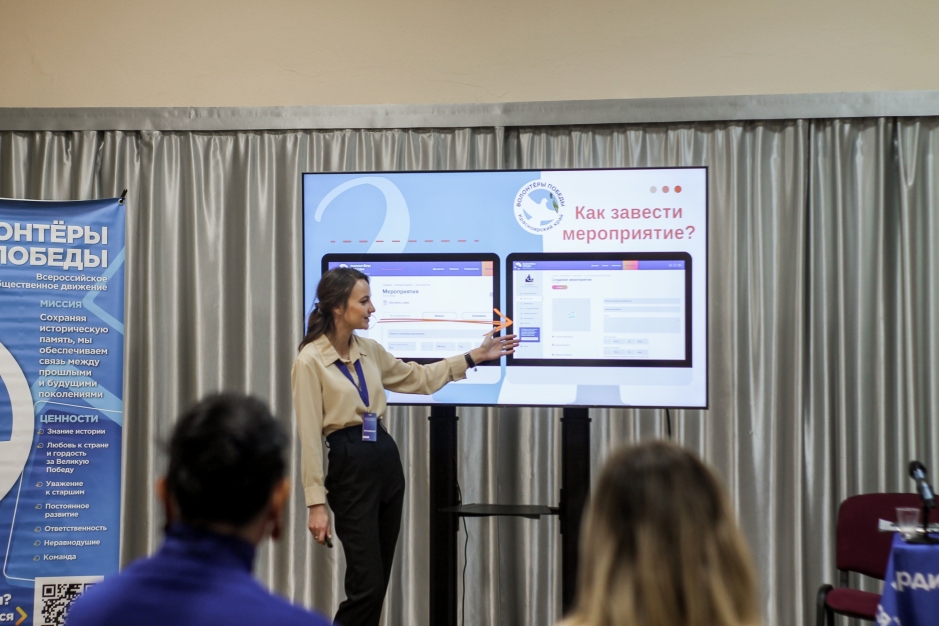 В составе выступающих также присутствовала Екатерина Егоровна Чернова - исполнительный директор Красноярского регионального отделения ВОД «Волонтеры Победы». Екатерина рассказала участникам об организации работы движения в муниципальных образованиях Красноярского края в новом 2023 году.