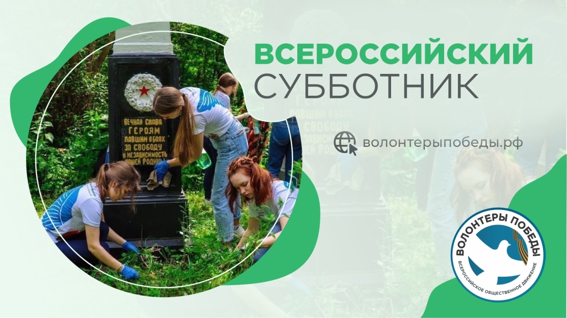 7 апреля Волонтеры Победы дадут старт традиционному Всероссийскому субботнику. Представители Движения в городах и селах России благоустроят памятники и мемориалы, посвященные Героям Великой Отечественной войны, а также воинские захоронения, над которыми добровольцы ведут шефство. Волонтеры Победы соберут мусор, скопившийся после зимы, обновят краску оград, очистят памятные места от грязи и при необходимости проведут косметический ремонт памятников.