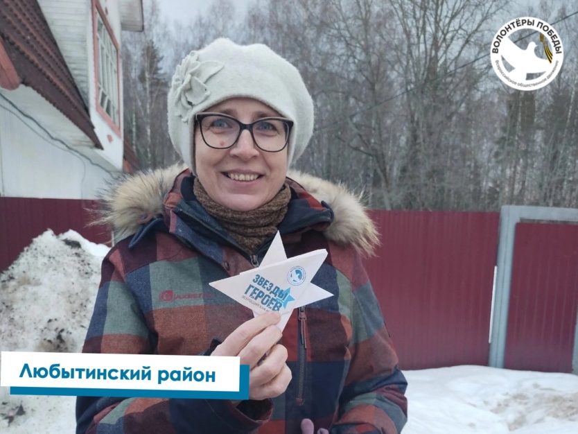 Волонтёры Любытинского района вручили тематическую листовку в виде пятиконечной звезды с информацией о наших земляках, удостоенных «Золотой Звездой» за совершенные подвиги при исполнении боевых задач.