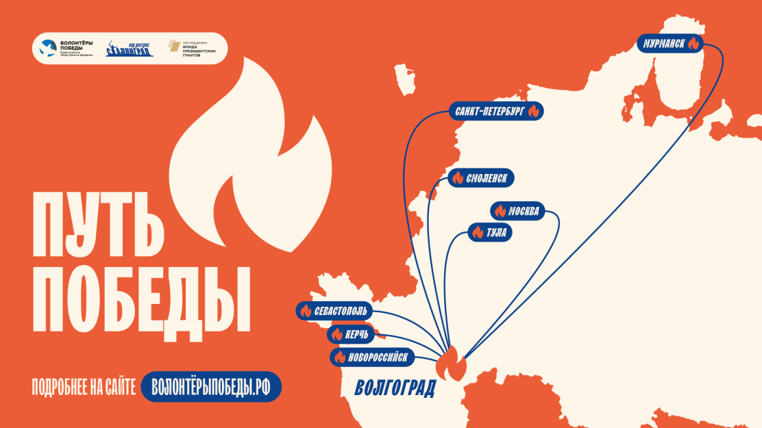 Волонтёры Победы продолжают проводить серию мероприятий, посвященных 80-летию Победы в Сталинградской битве. 17 апреля Движение запускает Всероссийскую акцию «Путь Победы». В рамках акции добровольцы доставят в Волгоград частицы Вечного огня из городов-героев России, чтобы в ночь с 21 на 22 июня на Мамаевом кургане зажечь огненную картину войны вместе с неравнодушными жителями города.