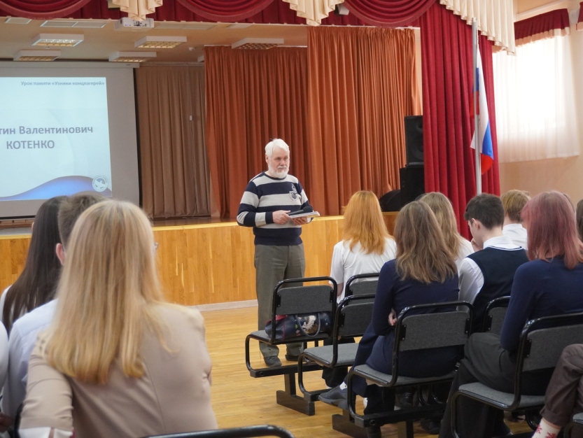 В Тюменской области прошел урок для учеников 10-х классов. В ходе урока Волонтёры Победы рассказали учащимся о некоторых концлагерях (Дахау - как самый первый лагерь, Освенцим - как самый известный «лагерь смерти» и Саласпилс - «фабрика крови»), про «эшелоны смерти», про то, что испытали люди, попавшие туда. В уроке принял участие Валентин Валентинович Котенко, малолетний узник концлагерей. Валентин Валентинович поделился историей своей жизни и страшных испытаний, которые выпали на долю его семьи. Войну родители Героя встретили в городе Краматорске Донецкой области. Гитлеровцы оккупировали Донбасс. Мама Валентина Валентиновича в 1943 году была направлена в лагерь для пленных, который располагался в Австрии. Здесь и родился Валентин Котенко. Потом они вместе с мамой были перенаправлены в Германию, в город Гера, в лагерь, где располагалась фабрика, на которой трудились все военнопленные. Весной 1945 года лагерь освободили, и семья вернулась на Родину.