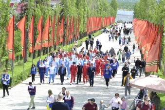 Добровольцы вместе с бывшими игроками «Спартака» и «Динамо», ветераном Великой Отечественной войны Александром Васильевичем Медковым и другими неравнодушными гражданами провели церемонию возложения цветов на Мамаевом кургане.