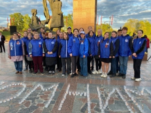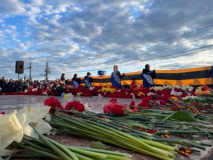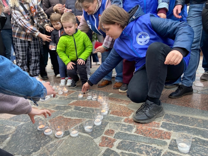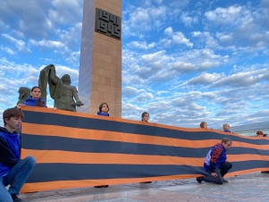 Затем собравшиеся почтили память павших героев минутой молчания и возложили цветы к мемориалу. В ознаменование 78-ой годовщины Победы в Великой Отечественной войне и в память о подвиге советского народа участники патриотического флешмоба зажгли свечи и выложили из них слово «ПОМНИМ»
