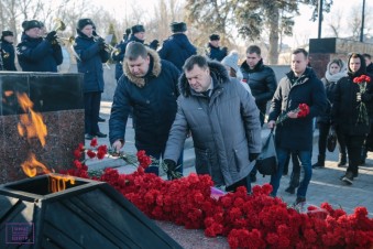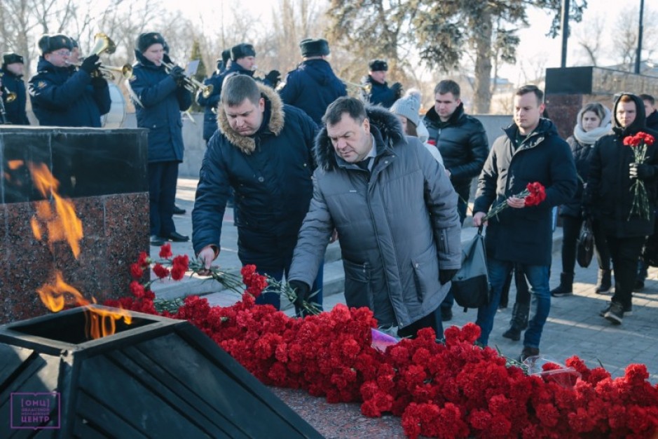 В возложении приняли участие губернатор Воронежской области Александр Викторович Гусев, руководитель департамента образования, науки и молодежной политики Воронежской области Олег Николаевич Мосолов, а также добровольцы, жители города, члены Совета ветеранов, представители Воронежской.