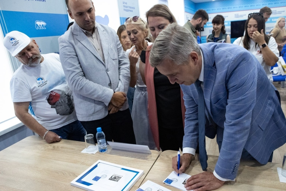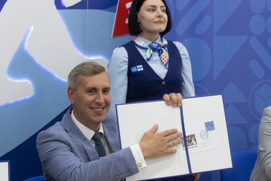 Председатель Законодательного Собрания Красноярского края Алексей Додатко, директор Управления федеральной почтовой связи Красноярского края Юрий Кочнев, и.о. министра цифрового развития Николай Распопин поставили оттиск специально изготовленного художественного почтового штемпеля и свои подписи на марки и конверты первого дня.