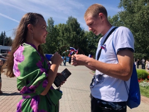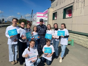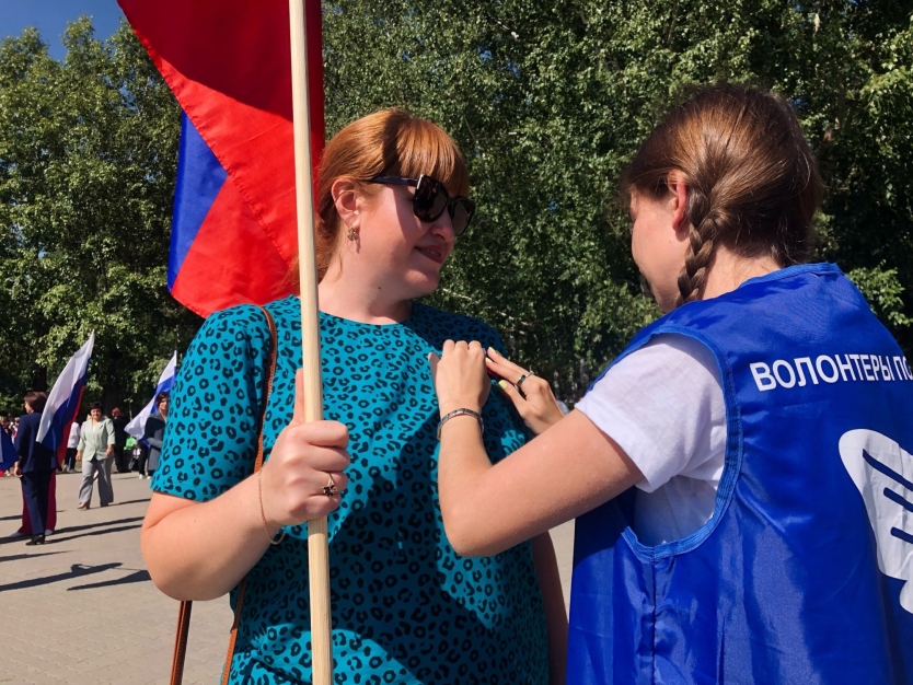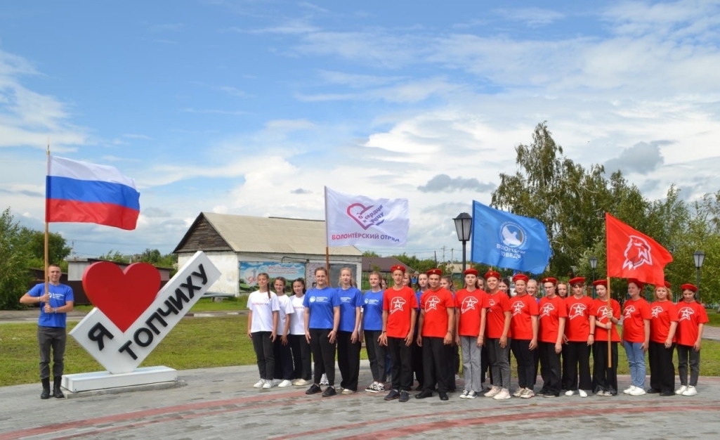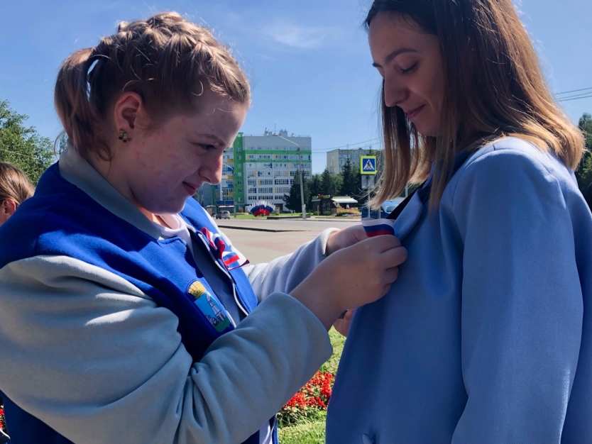 У Волонтёров Победы Топчихинского района день начался с церемонии поднятия государственного флага России и флагов молодежных общественных объединений. Под гимн нашей страны торжественно реели флаги и напоминали всем об единстве народа. Также активисты с улыбками на лицах раздавали ленты-триколор местным жителям. Многим людям было приятно получить небольшой подарок и с гордостью они крепили ленту к одежде.