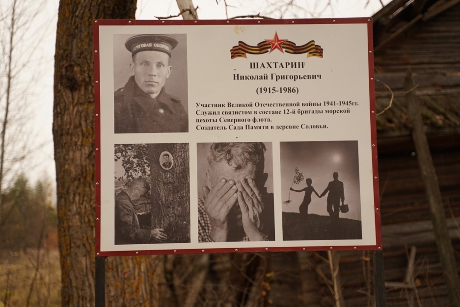 На протяжении 25 лет он сажал и обустраивал сад памяти. На каждом из посаженных в нём деревьях была закреплена табличка с именем погибшего на фронте уроженца деревни Соловьи или какой-либо из соседних деревень. Несмотря на слепоту, Николай Григорьевич трудился по 12 часов в сутки. Семь лет понадобилось на создание пруда напоминавшего ветерану о его службе на море. В центре сада была построена не глубокая землянка, на стенах которой по просьбе Николая Григорьевича, его сын написал историю создания сада, биографию его создателя и приписал: «Пусть катера плывут по мирному Баренцеву морю, в котором я стал инвалидом. Пусть эта многострадальная война никогда не повторится».