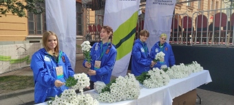 Наши волонтёры измеряли температуру участникам мероприятия, раздавали цветы и значки, помогали в подготовке партера, сопровождали ветеранов и жителей блокадного Ленинграда до посадочного места.