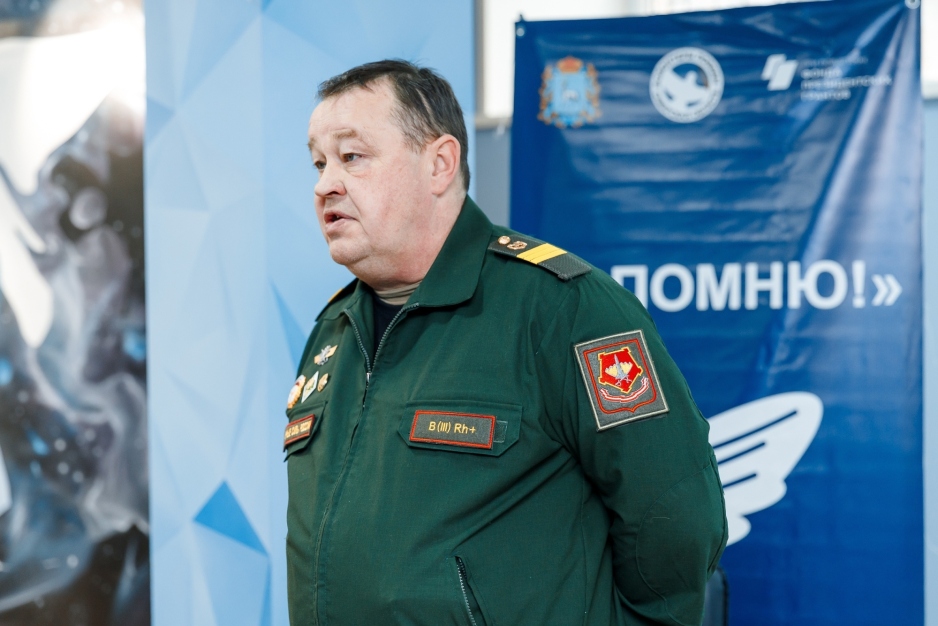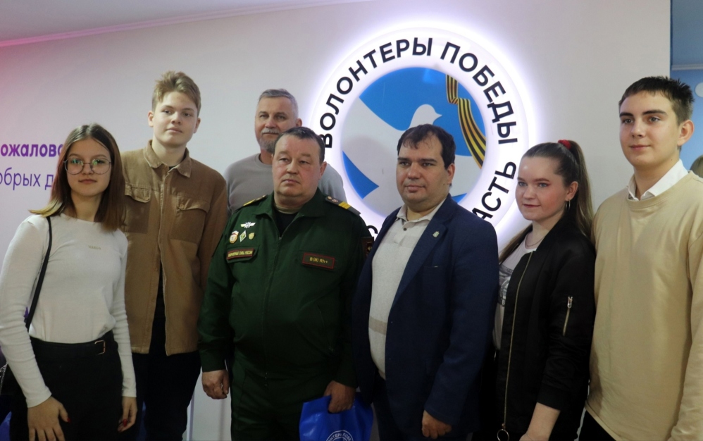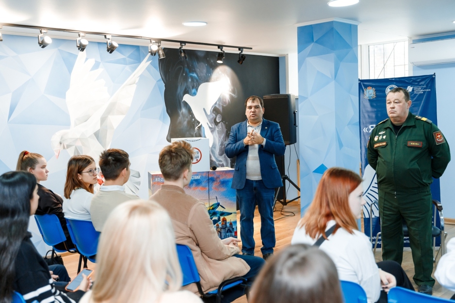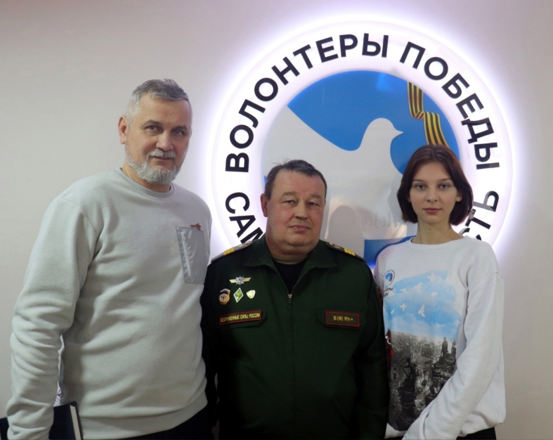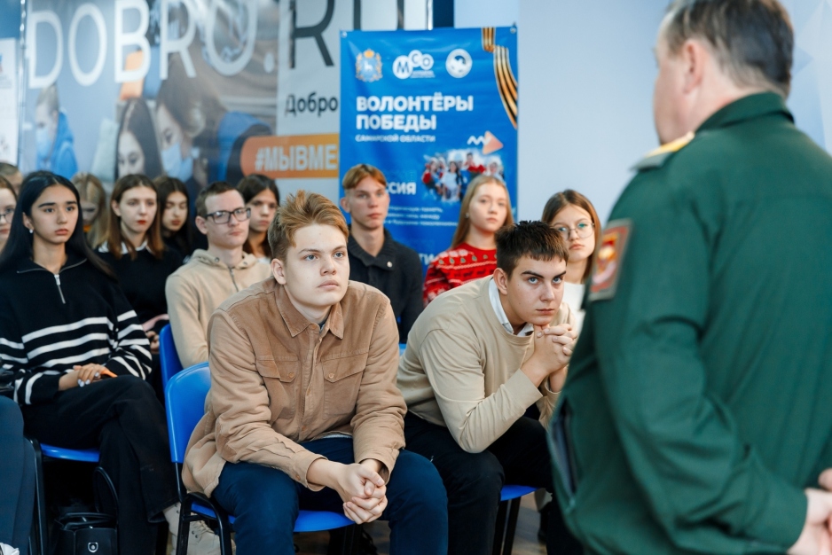В преддверии Дня Героев Отечества в Штабе Волонтёров Победы Самарской области добровольцы, студенты и школьники встретились с Сергеем Ивановичем Елхимовым – участником СВО, сержантом ВС РФ, представителем фонда «Защитники Отечества».