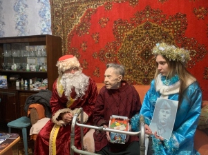 Ребята в канун Нового года в костюмах Деда Мороза и Снегурочки навестили Александру Тимофеевну Титову, поздравили ее с наступающим Новым годом, подарили сладости, хорошее настроение и смогли лично сказать «спасибо».