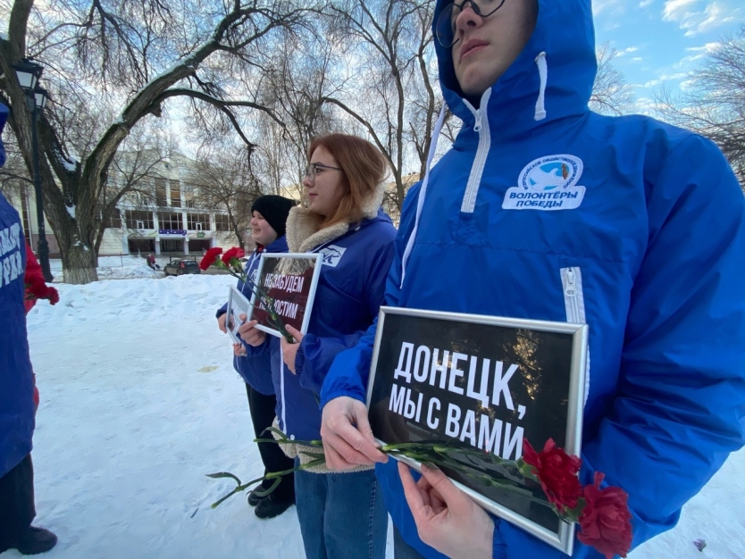 Волонтёры Победы Саратовской области совместно с активистами общественных организаций, возложили цветы к памятнику и почтили память погибших при обстреле в Донецке. В результате обстрела по рынку и магазинам в квартале «Текстильщик» погибло 27 человек, еще 25 получили ранения.