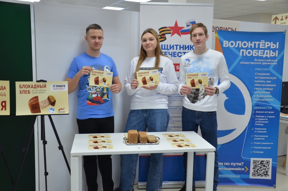 Также Волонтёры Победы провели акцию «Блокадный хлеб», в рамках которой раздали всем присутствующим листовки о блокаде, а также рассказали основную информацию об этом историческом событии. Также каждый участник получил символ акции - кусочек хлеба весом 125 грамм.