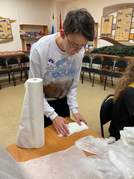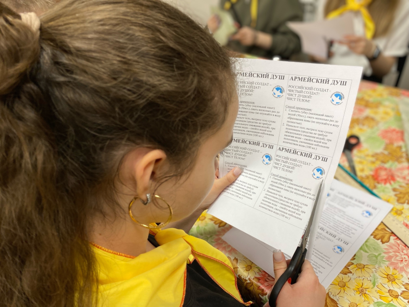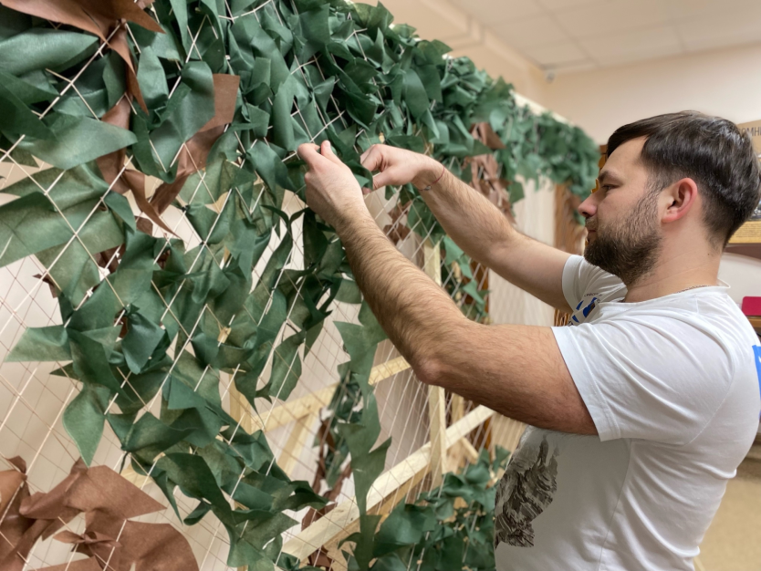 В рамках мастер-класса участники узнали о сухом душе и научились его изготавливать. После изготовления 70 упаковок душа для солдат, активисты помогли в плетении маскировочной сети.