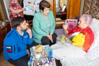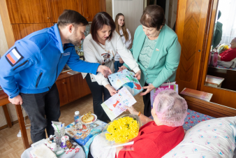 Ветерану вручили букет цветов, подарки и рисунки с благодарностью от дошкольников. Мария Леонтьевна задула свечки на пироге и загадала желание.