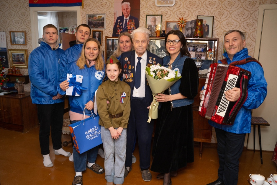 С праздничным концертом волонтеры навестили участника Великой Отечественной войны, почетного ветерана Нижнего Новгорода, заслуженного ветерана Нижегородской области Евгения Макарова. Под звуки баяна для него исполнили любимые песни, а самые юные гости прочитали патриотические стихотворения.