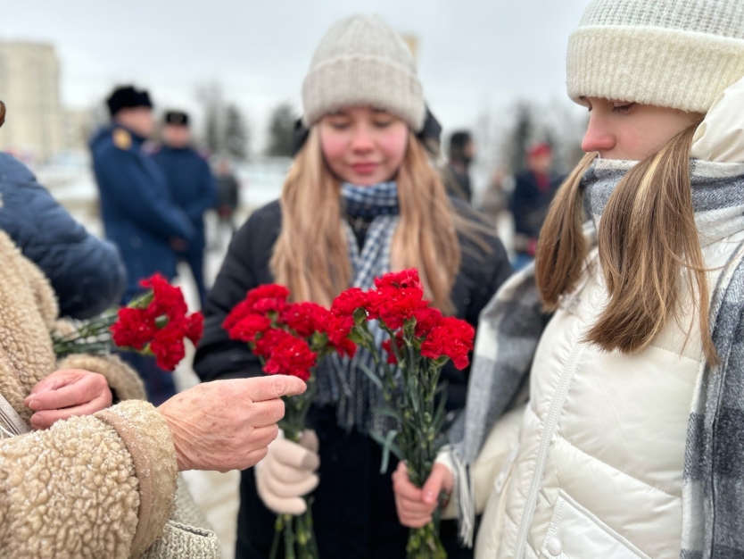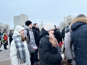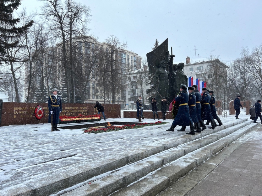 Сегодня у Вечного огня на площади Победы первые лица области и города возложили памятную гирлянду, цветы и венки в честь Дня защитника Отечества.