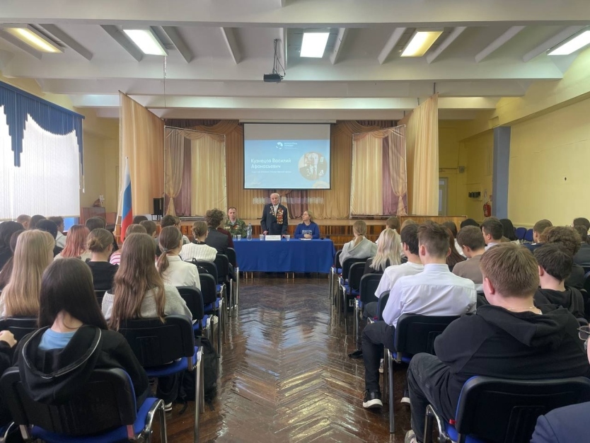 Центральной площадкой в Нижнем Новгороде стала школа №128, где старшеклассники встретились с участником Великой Отечественной войны, почетным ветераном Нижнего Новгорода, заслуженным ветераном Нижегородской области Василием Кузнецовым и участником специальной военной операции, награжденным медалью «За отвагу» Владимиром Медведкиным.