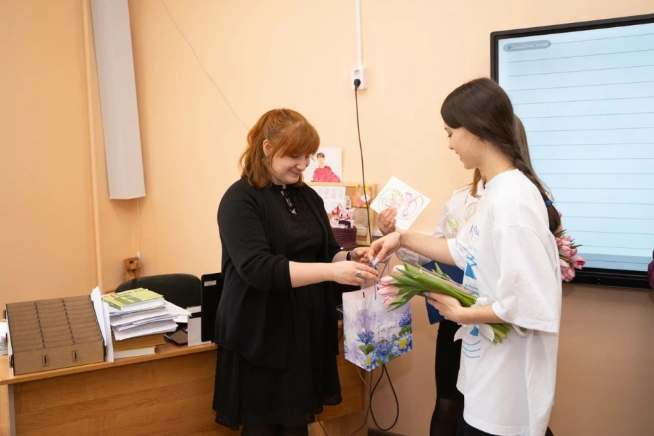Одно из поздравлений прошло в школе №66 им. Ю.А. Гагарина в Нижнем Новгороде, где волонтеры с любимыми песнями под звуки баяна поздравили более 40 женщин-педагогов. Вместе с теплыми поздравительными словами преподаватели получили букеты цветов, приятные подарки и открытки с добрыми пожеланиями, сделанные детьми.