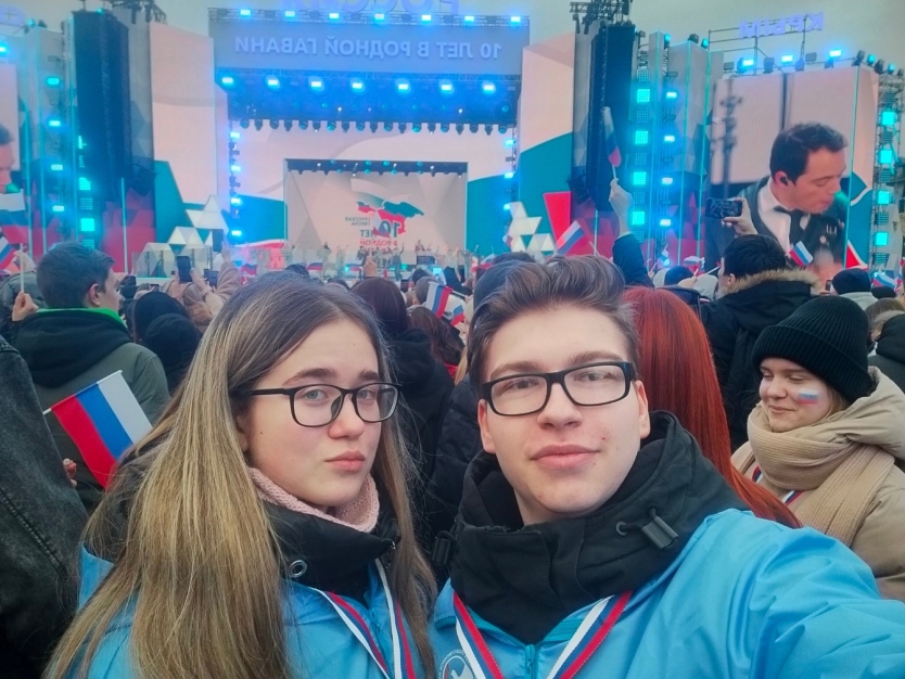 Одними из участников митинг-концерта стали активисты Всероссийского общественного движения «Волонтёры Победы» из Калужской области Роман Чертков и Елизавета Азарова.