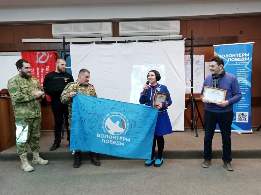 Почётными гостями встречи стали ветеран Великой Отечественной войны Георгий Иванович Абакумов со своей супругой Софьей Васильевной и бывшая жительница блокадного Ленинграда Марина Александровна Шеманская. Кульминацией торжественного вечера стала незамысловатая церемония передачи руководителю обнинского местного отделения Движения Татьяне Жеглатой флага нашей организации, который на протяжении нескольких месяцев находился на линии боевого соприкосновения в возвращенных регионах страны. За это время свои подписи и благодарности волонтерам за веру и поддержку на нём оставили более сотни военнослужащих.
