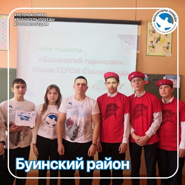 С Волонтёрами Победы Буинского района и Юнармейцами провели урок мужества «Босоногий гарнизон. Юные герои Сталинграда». «Босоногий гарнизон» – отряд, противостоявший фашистским захватчикам. Война стремительно ворвалась в их счастливое детство, заставив резко повзрослеть.