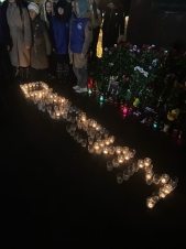 У стихийного мемориала памяти жертв позавчерашней трагедии завершилась акция «Свеча памяти». Волонтёры и неравнодушные жители выложили из свечей слово «скорбим».