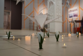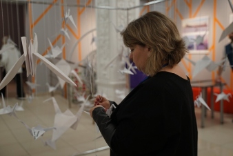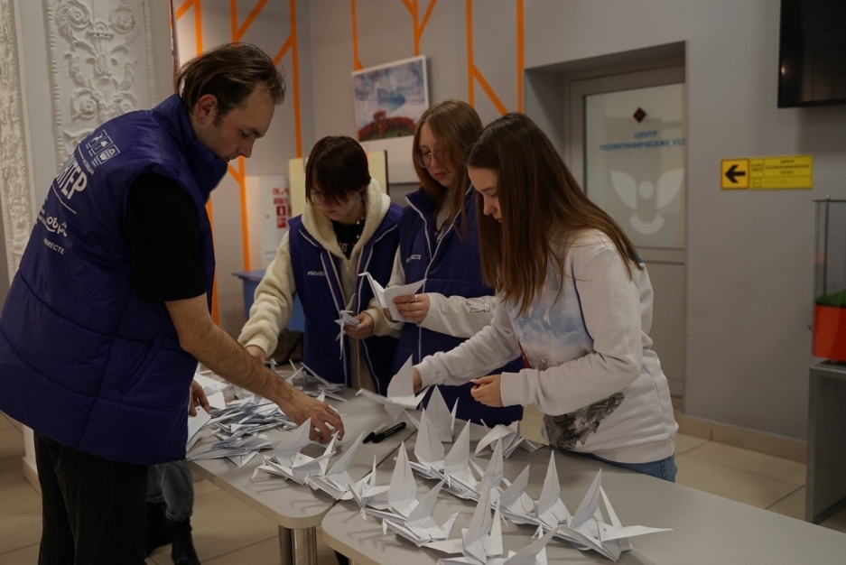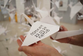 Добровольцы предлагали участникам акции прикрепить бумажного журавлика, со словами поддержки, к памятному арт-объекту. Бумажный журавлик стал негласным символом трагедии!