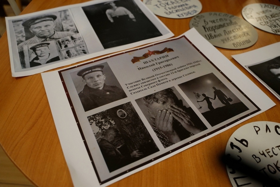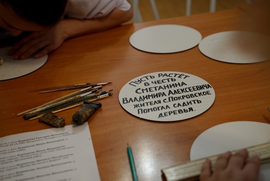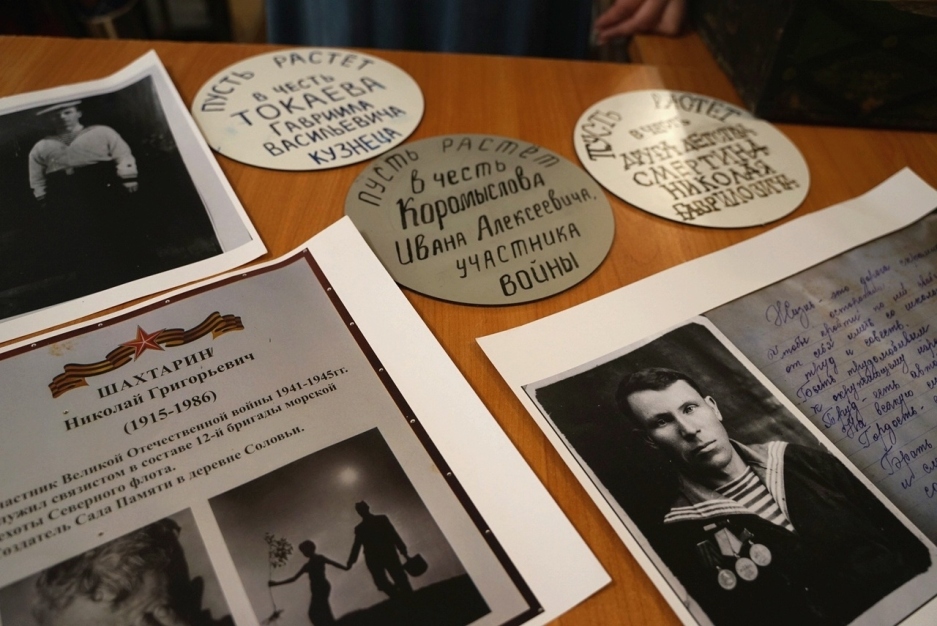 В Центре русской культуры и письменности «МИР» наши добровольцы помогали в восстановлении табличек, которые пришли с течением времени в негодность. На них нанесены имена и фамилии тех, кто погиб в годы Великой Отечественной войны из деревень Соловьи и Леушино, имена фронтовиков, пришедших с войны и людей, которые помогали ему в создании Сада Памяти.