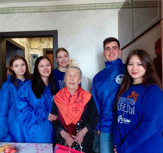 Во время поздравления волонтёры вспомнили вместе с юбиляром любимые песни военных лет, вручили женщине цветы и подарки.